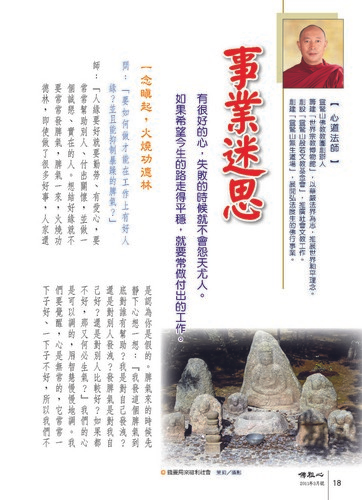 師:「人要有一個『空檔』才會舒服,因為人有接受的極限,你不停地做,會把自己逼急了。煩的時候就念佛、持咒,移轉那份執著。我們要放鬆,心才會放下,你不妨聽聽音樂,或是在辦公室放一些可以綠化環境的擺設,這些都可以幫助你鬆弛身心。」