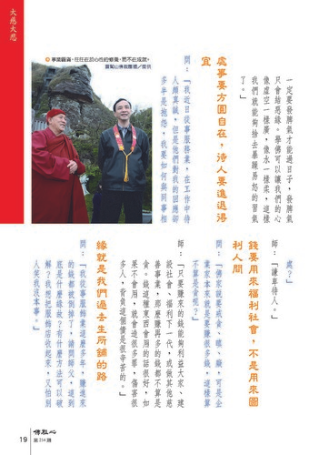 師:「不是這樣的,我本身也很忙啊!但是我就不會讓自己變成那樣。那完全是他們不懂得調心,不懂得在心裡留一點空間;我們做事要有段落,不能一次把自己的體力榨乾。有時候要離開事相,腦筋才會有閒暇,才不會心浮氣躁;如果不懂得離開,腦筋就會被綁住了。」