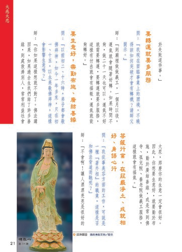 師:「你如果這樣想就不對了。佛法講因果,如果過去生我們結了許多善緣,到處救濟別人,常常利益社會大眾,那麼你的生意一定會很好。因此,你想要生意好,就要勤於布施,勤於廣結善緣,或是常到佛寺、孤兒院、養老院做義工服務,這樣就會有福氣。」