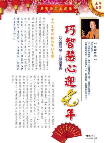 最幸福的新年賀禮,是藝術,更是善知能量,讓家庭、事業、人際關係,更臻祥和圓滿。2011金兔年,佛光山開山宗長~星雲大師,以「巧智慧心」傳達祝福,祈願大眾:說話有技巧、做事懂善巧、反應能敏巧、思想達智巧、讀書用心巧、做人要靈巧、凡事能活巧。新的一年,處事皆能慧巧活用,生活必能自在無礙!