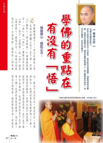 覺悟到這顆本自具足的清淨心就是佛。那麼,清淨心是什麼東西?它不是有形相的事物,無法用言語形容,亦無法以筆墨描繪,但處處起作用。我現在講話就是,你們聽課也是——起作用,此係就事相上而言。佛性就是理,但不離事用,不壞事相。因此,就理體來講,是絕對的;就事相上來講則千差萬別。開悟即是在一切的事相上,悟到絕對的空性。古時候,有人打破碗、打破杯子、打個香板就開悟。為什麼?在事相上體悟到這不生不滅的絕對理體,就叫做開悟。他就身心自在,萬緣放下。泰國高僧阿姜‧查說:「放下一切執著,是我們修行人一生一世的功課。」